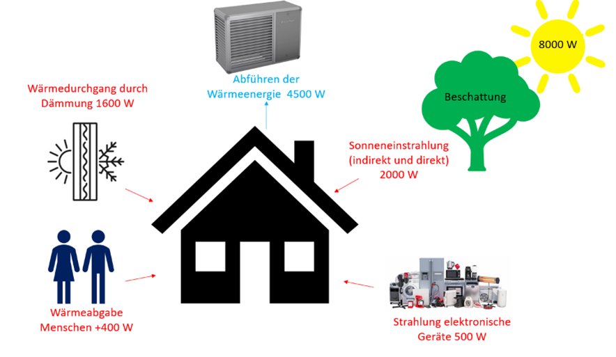 - Für ein Einfamilienhaus mit ca. 180 m² Wohnfläche ergibt sich eine Kühlleistung von 4–7 kW